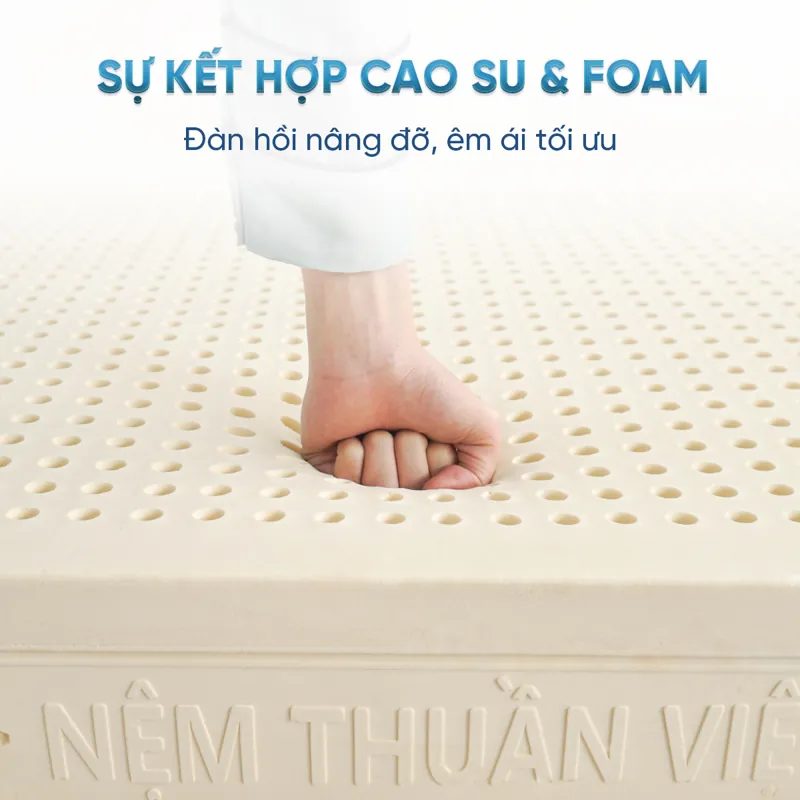 Nếu nệm cao su thiên nhiên thuần thiên về cảm giác vững và đàn hồi rõ, thì dòng cao su kết hợp foam thường được khách hàng chọn khi muốn “êm hơn một chút” nhưng vẫn cần nệm đỡ lưng ổn định, không bị lún sâu. Ở Nệm Thuần Việt, đây là nhóm nệm hay được tư vấn cho những anh/chị thích cảm giác nằm mềm mại, dễ thả lỏng, nhưng vẫn muốn cơ thể được nâng đều để ngủ dậy không mỏi.