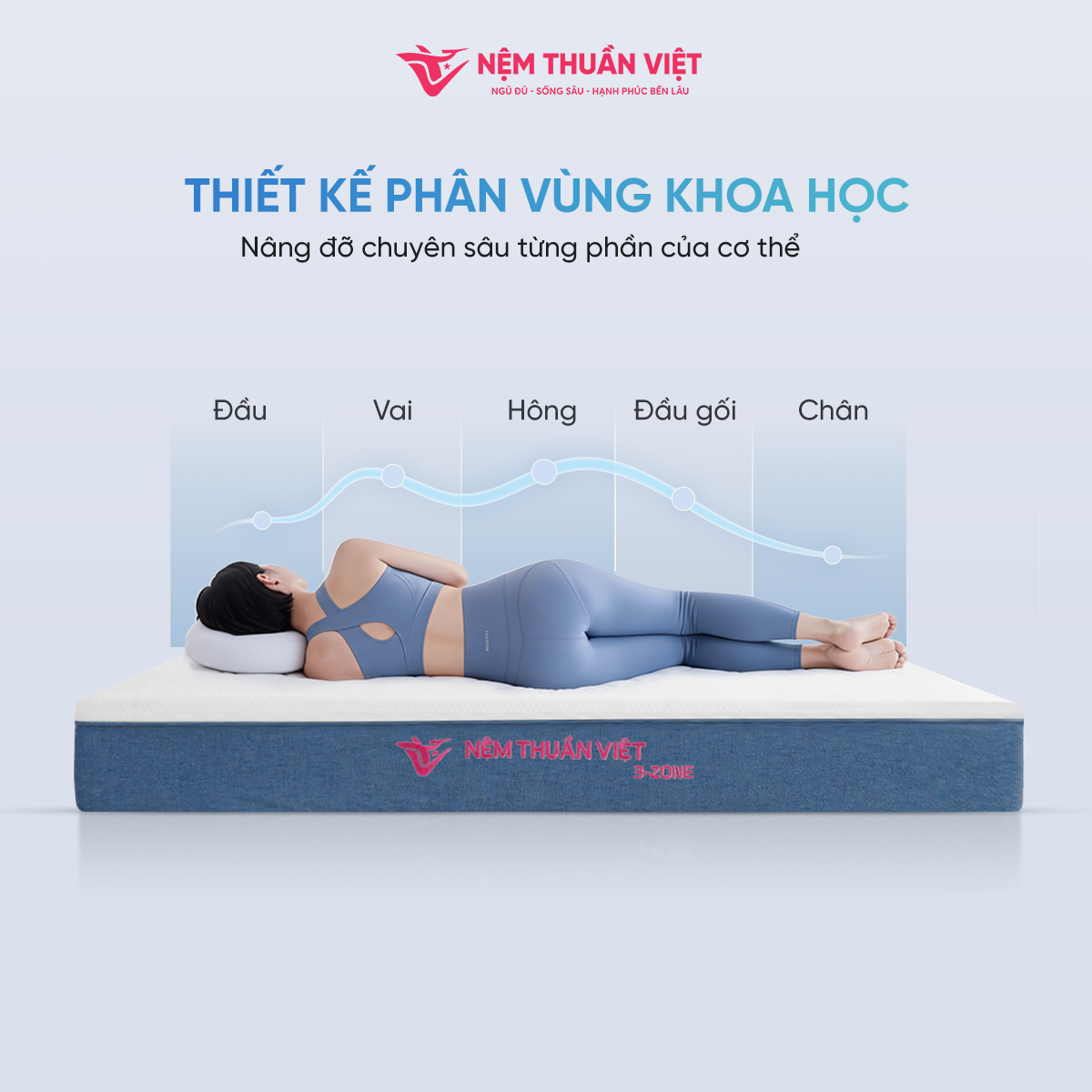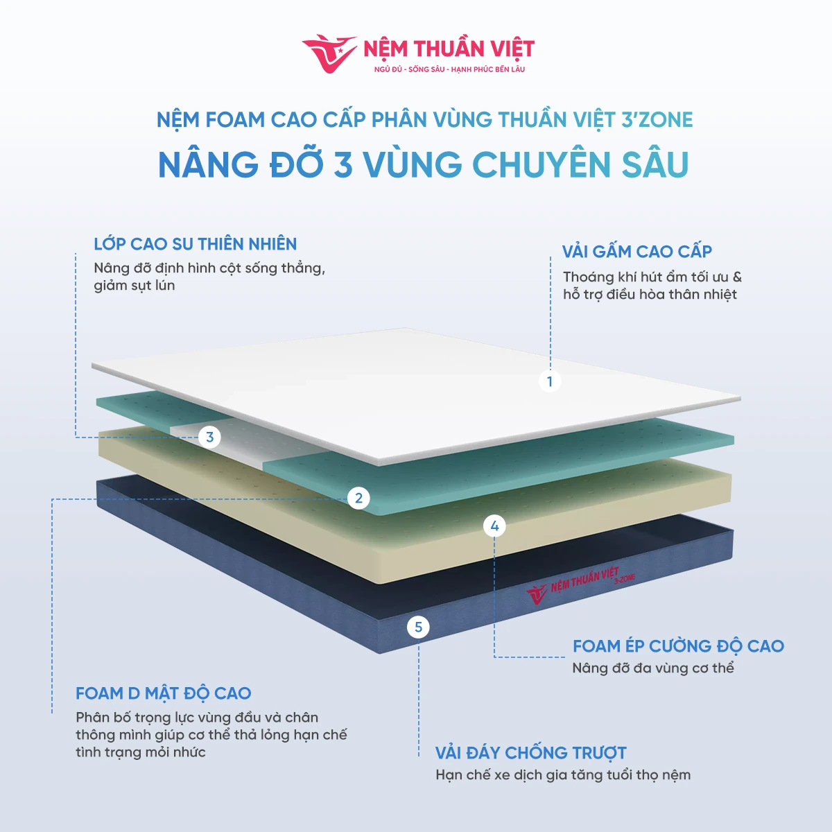 Nệm Foam cao cấp phân vùng Thuần Việt 3’Zone – Nâng đỡ 3 vùng chuyên sâu